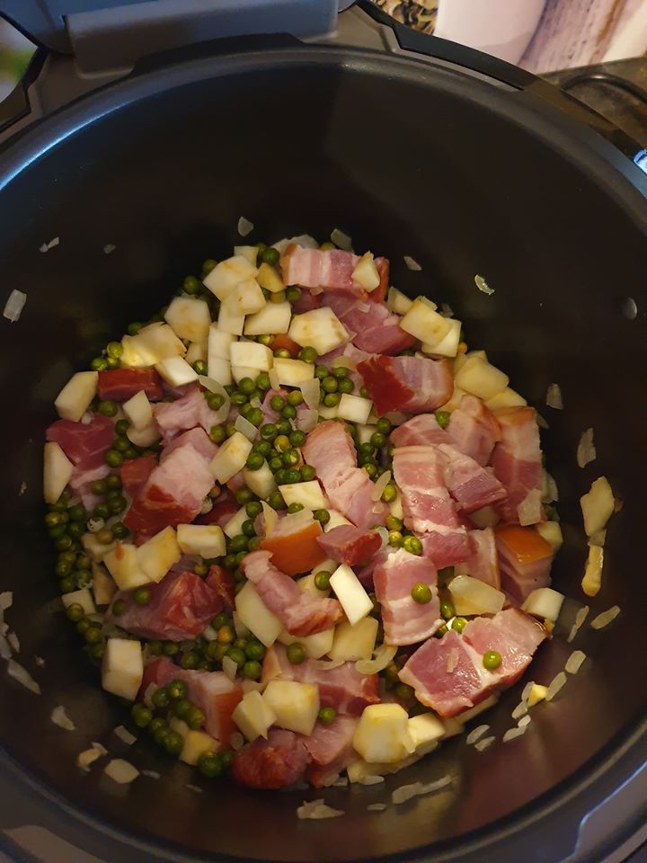 🔸 In der Zeit habe ich Bockwurst und Rauchenden in Stücke geschnitten und in der anderen Cook4Me kurz angebraten, alternativ in der Pfanne oder vor der Suppe in der Cook4Me anbraten