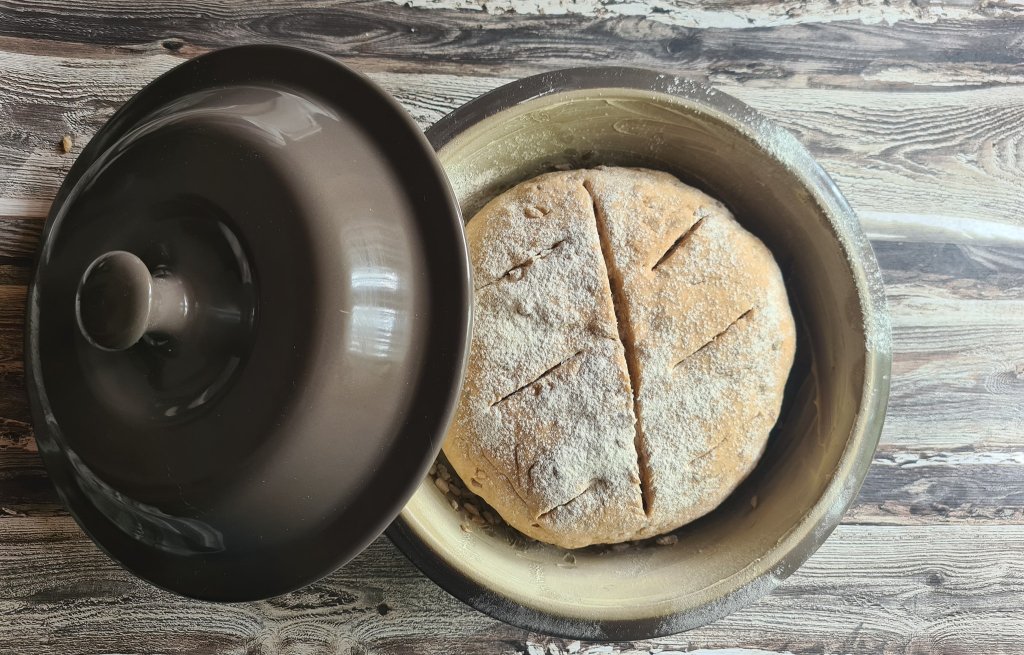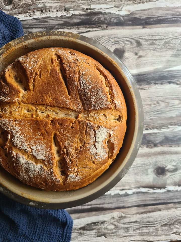 ▪Den runden Teig in die Form legen etwas bemehlen und nach belieben einschneiden, Deckel rauf und in den Backofen aufs unterste Rost stellen