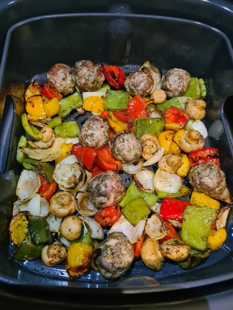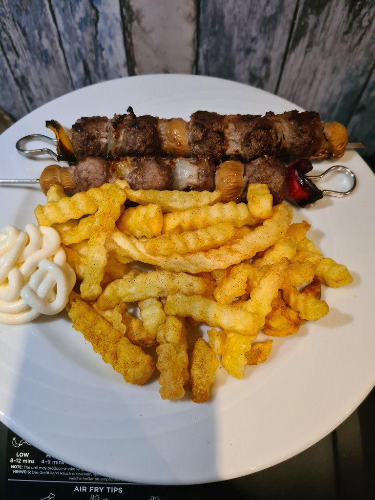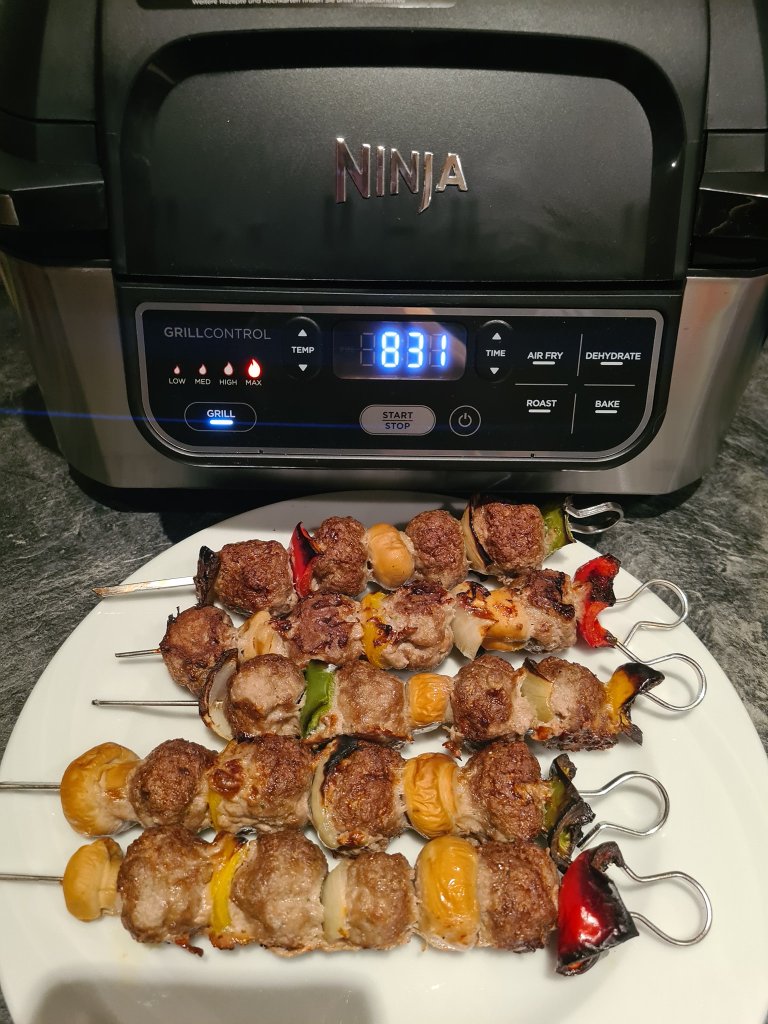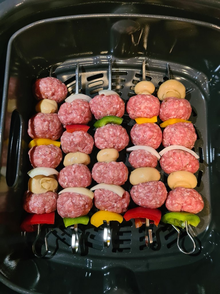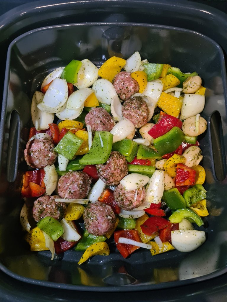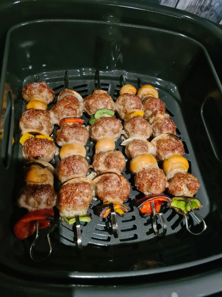 Ich habe die ersten Spieße schon zur Aufheizphase drin gehabt, ca 10 – 12 min waren sie gar, nächsten rein gemacht, wenn diese fertig sind die Hackbällchen Gemüse Pfanne rein geben, Einstellung lassen und ab und zu kurz wenden auch ca 12 min dann war alles gar