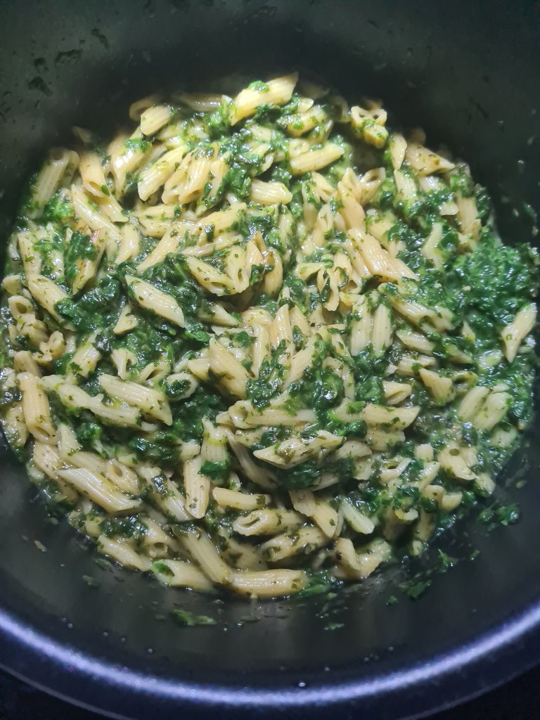 Die Nudeln in den Topf geben, mit der Brühe auffüllen bis alles gut bedeckt ist, würzen nach Geschmack, die 2 Brühwürfel dazulegen