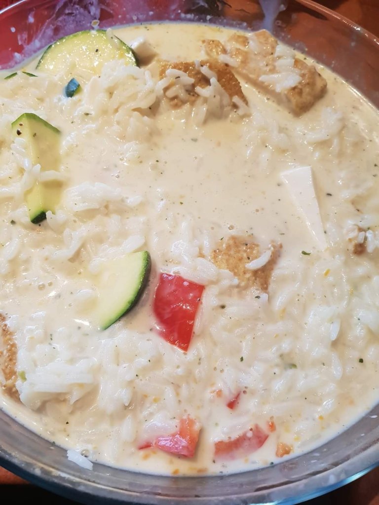 Den Reis abgießen und mit dem Gemüse in eine Auflaufform geben