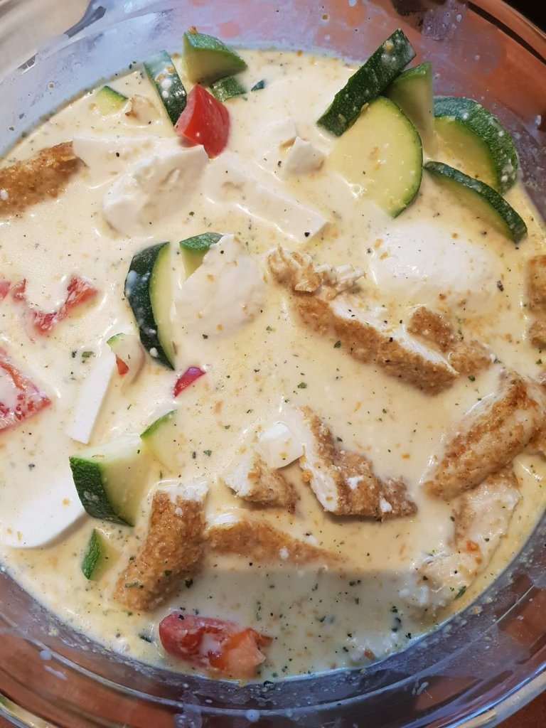 Die Sauce mit Gewürze abschmecken und über den Auflauf giessen
