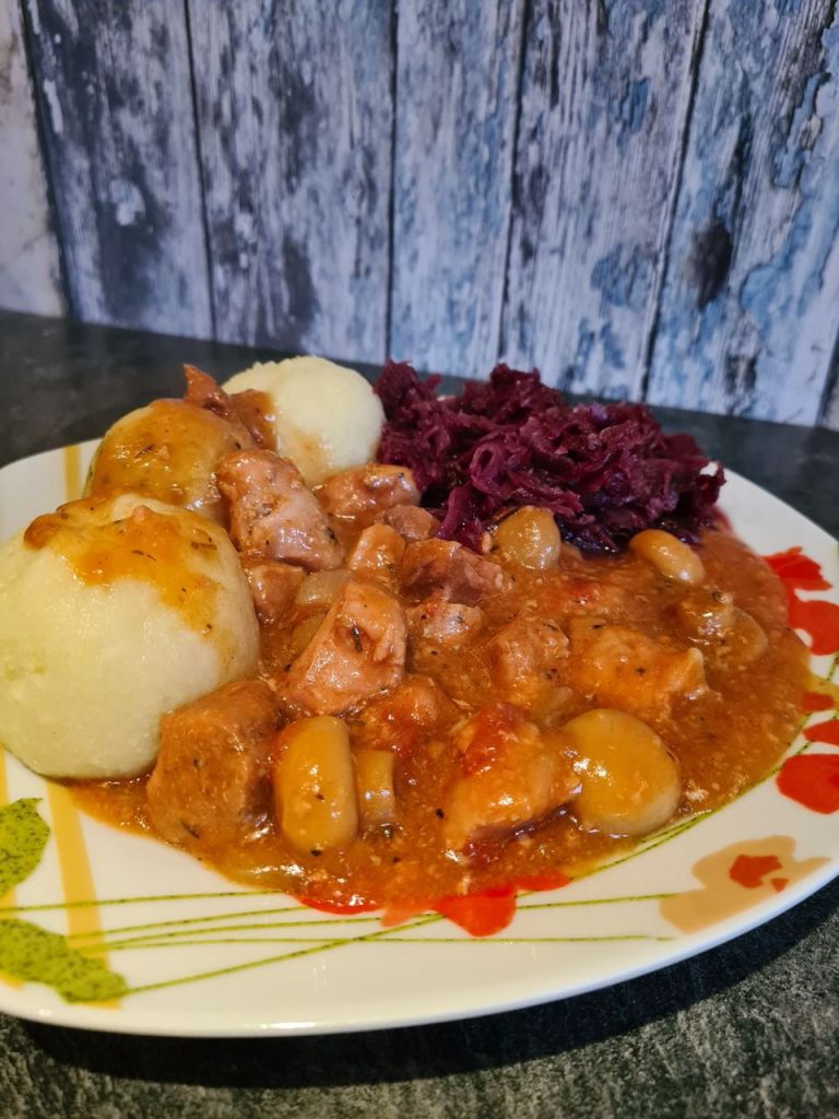 Wenn das Gulasch fertig ist könnt ihr nach belieben etwas Saucenbinder oder Mehl / Stärke mit etwas Wasser einrühren zum andicken