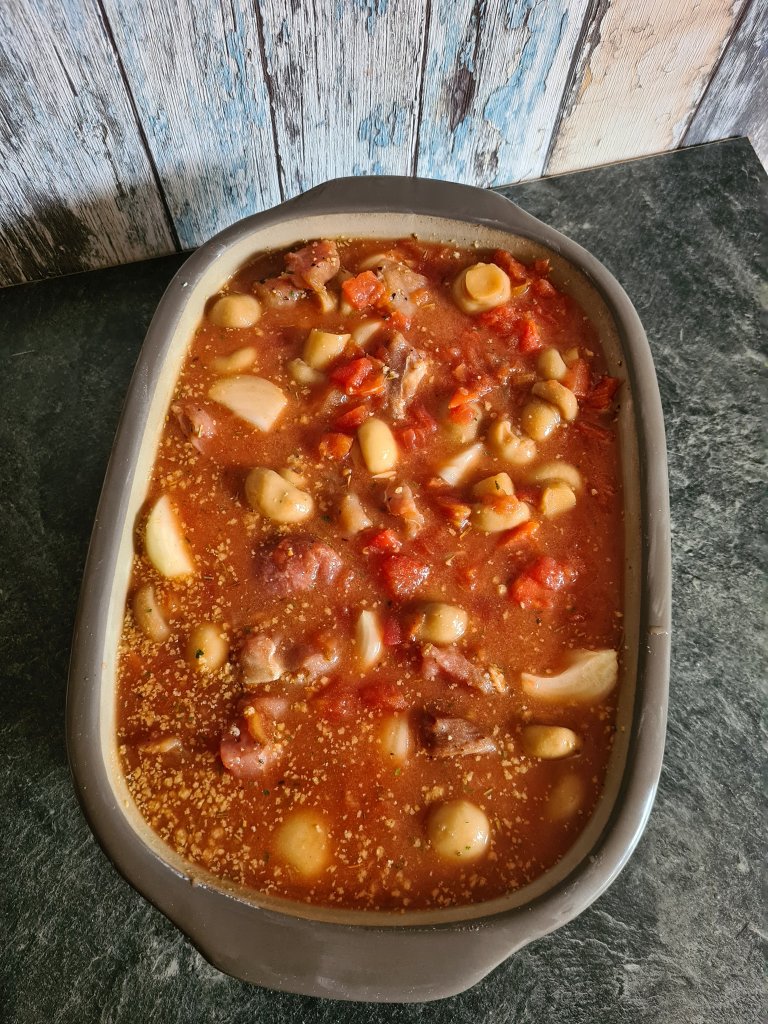 Die Brühe über das Fleisch giessen kurz alles gut umrühren, dann den Deckel drauf und das ganze dann für ca 2 Std und 20 min in den Backofen stellen